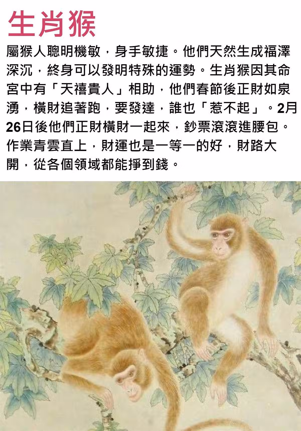 屬猴人聰明機敏,身手敏捷。他們天然生成福澤深沉,終身可以發明特殊的運勢。生肖猴因其命宮中有「天禧貴人」相助,他們春節後正財如泉湧,橫財追著跑,要發達,誰也「惹不起」。2月26日後他們正財橫財一起來,鈔票滾滾進腰包。作業青雲直上,財運也是一等一的好,財路大開,從各個領域都能掙到錢。