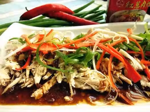 3.電鍋關關跳起雞肉拿出,稍涼撥成絲盛入盤中,淋上醬汁,放上蔥絲、辣椒絲(可省略)即可上桌