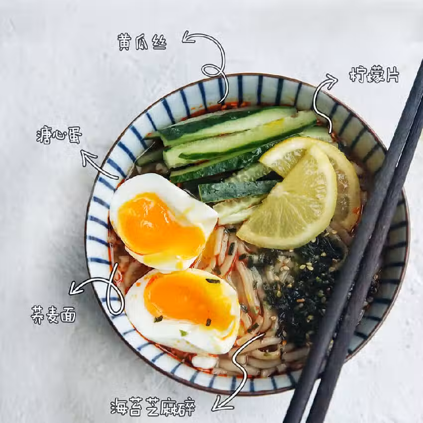 ③ 放溏心蛋、黃瓜絲、檸檬片、海苔芝麻碎,完成。