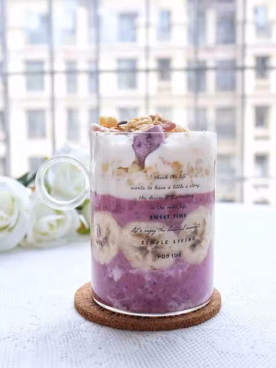 2、杯子裡鋪一層紫薯泥,然後一層燕麥、再一層香蕉泥;鋪一層紫薯泥