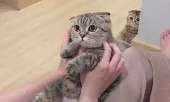 和小貓玩了一會兒後,女主人把貓放下去了臥室。但是當她轉身時,女主人看到大貓靜靜地躲在她的臥室門上,盯著女主人。女主人以為這只大貓有問題,就抱住了它,接過它問怎麼了。