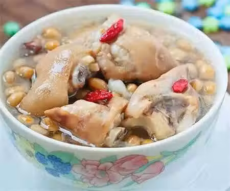 豬腳 (1000克)、黃豆 (400克)、調料清水 (適量、)油 (適量)、鹽 (適量)