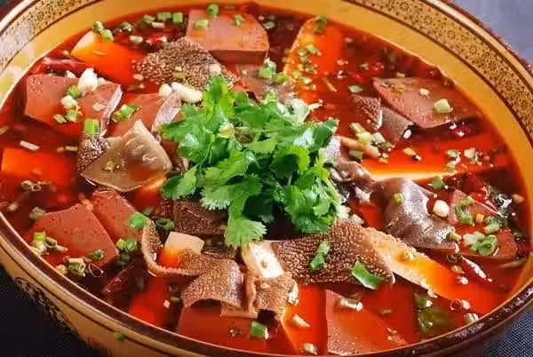 用料:豬肚適量、火腿200克、豬血250克、黃豆芽適量、萵筍適量、土豆1個、金針菇適量、金針菜適量、黑木耳適量、食鹽少許、雞精適量、姜5克、八角2個、花椒適量、桂皮1塊、干辣椒適量、料酒適量、大蒜5克
