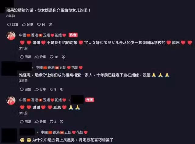 在丈母娘的社交平台上曾多次曬出過和女婿的合照,並配文寫道:「我超孝的女婿,緣分是很奇妙的,每次一起時有千言萬語滔滔不斷,彼此牽掛理解包容扶持,珍愛生命美好之旅感恩所有一切。」二人可謂是親如母子。悲劇發生後,Chris表示會照顧四名子女。
