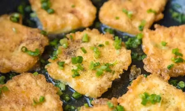 2、把老豆腐放入雞蛋液中滾一圈,然後再裹上澱粉,再蘸上雞蛋液即可。然後平底鍋中加少許涼油開中小火,油鍋熱後依次放入裹好雞蛋液的豆腐塊,煎至兩面金黃,撒上蔥花點綴取出。