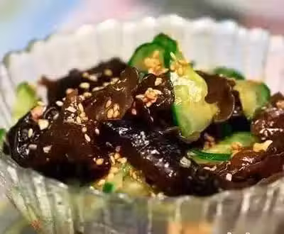 材料:黑木耳 30克、黃瓜 1根、紅尖椒 1/2個、蒜2瓣、姜 2片、食鹽 1/2茶匙、生抽 1/2湯匙、香醋 1/2湯匙、香油 1/2茶匙、橄欖油 1/2湯匙、白糖 1/2茶匙、雞精 1/4茶匙