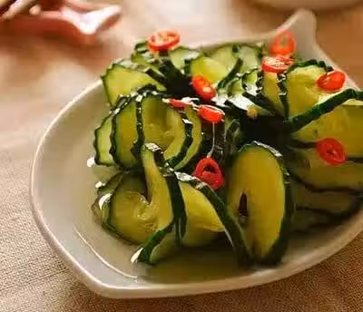 材料:黃瓜 2根、食鹽 1小勺、醬油 半小勺、醋 半小勺、辣椒(紅,尖,干) 3個、植物油 適量、白糖 1小勺、蒜 3瓣、花椒 15粒