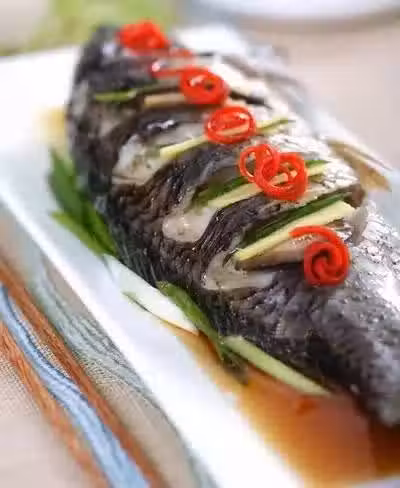 原料:活鯉魚1條、鹽1茶匙、胡椒粉1/2茶匙、料酒2湯匙、姜4片、干辣椒1個、蒸魚豉油2湯匙、香蔥適量。