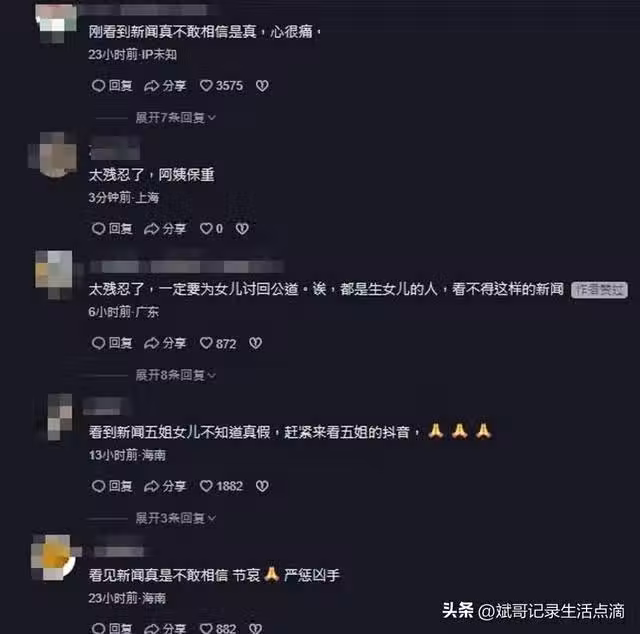 蔡天鳳被分屍的消息一傳出,許多網友湧入蔡媽媽的抖音號留言,希望她能節哀順變,也替她打抱不平,「太殘忍了,一定要為女兒討回公道,」女兒一定教育的很好,可惜遇到了人渣,太善良被人欺負了!對此蔡媽媽也點贊表示贊同,這也是她首次表達心聲。