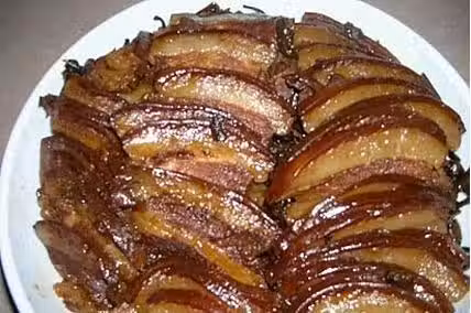 1、五花肉洗凈煮至斷生,趁熱搌干水份,在肉皮上抹勻醬油和一點紅糖(白糖也可),鍋內放油燒至五、六成熱,將肉皮炸呈金黃色撈出,切成稍厚的片(約0.5厘米),肉皮朝下貼碗底排列放好。