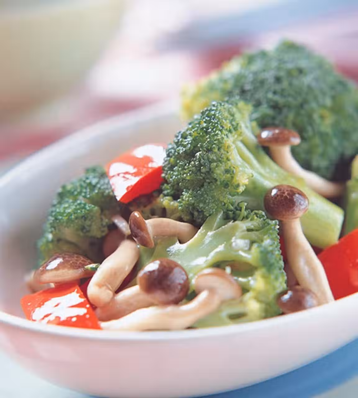 2 鍋中加1大匙沙拉油,小火爆香蒜末,加入綠花椰菜、鴻禧菇、紅甜椒拌炒數下