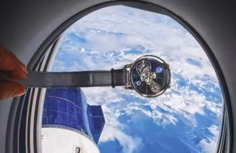 2022年又有另一個品牌的錶首度被戴去太空,而且可能有點出乎你的意料,因為那是美國獨立製錶品牌JACOB & CO.的新作Astronomia Bucherer BLUE Tourbillon,事實上這款錶是JACOB & CO.、Bucherer和蘇富比三間公司合作的產物,全球就這麼一隻,同時手錶也融入與三間公司相關的元素,創作目的帶有公益慈善意義。