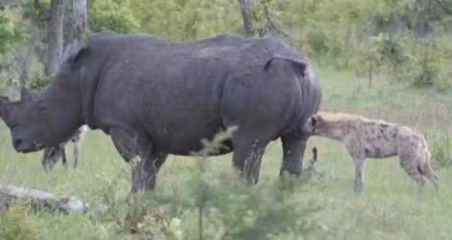 鬣狗想要對落單犀牛「進行掏肛」,奈何遇到一個「不銹肛」:咦?技術減退了??