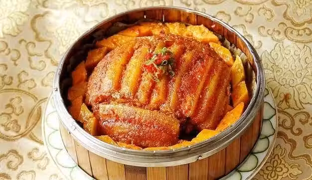 原料:五花肉400克、南瓜約600克、蒸肉粉2盒、蔥1根、酒1大匙、醬油1大匙、甜麵醬1大匙、辣豆瓣醬1/2大匙、糖1/2大匙、蒜末1茶匙。