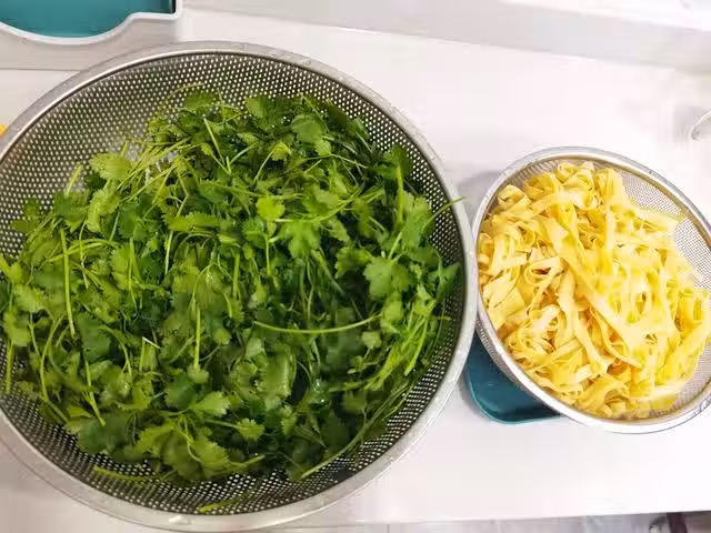 2、 千張放入鍋中焯一下水,撈出後切成細絲。