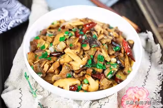 第二步:香菇切厚片,姜蒜切片,蒜苗切碎,干辣椒切段,三層肉切薄片,三層肉下鍋炸干,把多餘的油倒出,放入薑片,蒜片,干辣椒爆香,放入香菇翻炒,調入鹽,胡椒粉翻炒至熟,起鍋前撒入青蒜苗即可,一道特別簡單又美味的家常菜有機鮮香菇就做好咯!