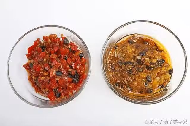 第三步:兩種剁椒要分開炒,先炒海南辣椒醬,鍋里放適量油燒熱,放入蒜蓉先爆香,在放入辣椒醬,豆豉,蒸魚豉油和適量鹽,糖,翻炒均勻,湖南紅色剁椒也是一樣的炒,鍋里放油燒熱,放入剁椒,豆豉,蒸魚豉油和鹽,糖,翻炒均勻即可起鍋