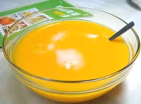2、取部分南瓜塊放入攪拌機,加水(水量可決定湯的濃稠度,可稀可稠)、一小勺鹽(不要多,調出微微的鹹味即可),開機攪拌成細細的茸狀,倒出,在上面淋上少許的椰奶即可。