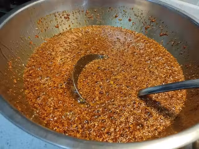 8、緊接著加入一瓶蓋的陳醋,這個時候辣椒油中會產生比較激烈的反應,用勺子快速攪拌幾下。最後加一瓶蓋陳醋,可以徹底激發出辣椒的香辣味,很多人炸辣椒油的時候少了這一步,導致炸出來的辣椒油不夠香。