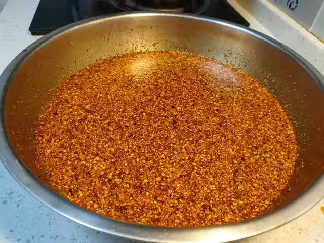 做辣椒油時,一定要掌握好辣椒和油的比例,辣椒少了的話香辣度不夠,辣椒太多了也不合適,辣椒和食用油最合適的比例為1:6左右。粗辣椒麵和細辣椒粉的比例為2:1,辣椒麵香味足,辣椒粉出色好。