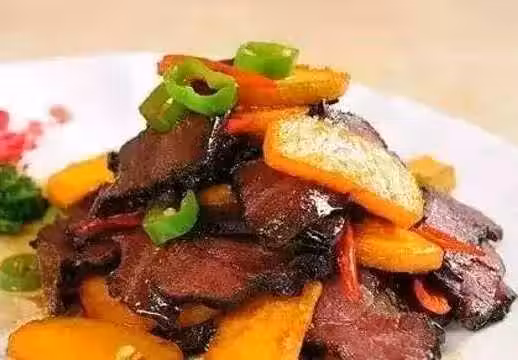 1.老臘肉煮熟後,撈出來切成片;老南瓜削去皮後,切成厚片投入色拉油鍋里,炸至斷生便倒出來瀝油。