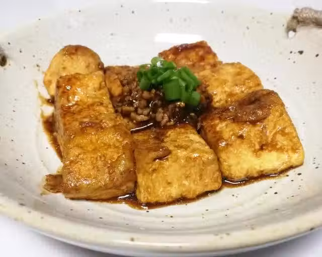 豆腐切成塊狀後下油鍋中小火煎,一面成金黃色後再翻轉煎另一面。