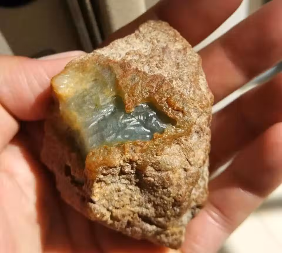 在手電燈光下,這塊石頭底子非常好,打燈整個石頭都亮了起來,說明種水不錯,而且內部相對較為完美,沒有光線阻隔的感覺,說明紋裂也不太多,接下來就看如何來設計雕刻這件作品了。