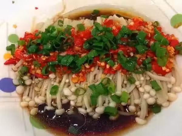 金針菇300克、剁椒2勺、細香蔥2根、植物油1勺、蒸魚豉油1勺。