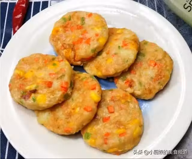 土豆泥。胡蘿蔔丁、青椒粒、玉米粒、雞胸肉丁混合在一起,加入3勺麵粉,加入1勺生抽、鹽、1勺生抽、胡椒粉調味,攪拌均勻。