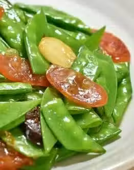 荷蘭豆200g;臘腸1/2條;潤腸1/2條;蒜片2瓣的量;鹽1/4茶匙;糖1/4茶匙;米酒1茶匙