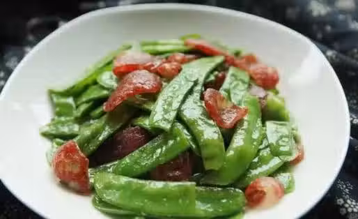 鍋中放食用油,先下香腸煸香,淋一點料酒,然後下荷蘭豆翻炒。