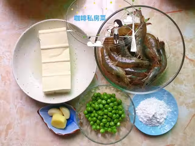 6、炒鍋留底油,入姜和蒜片爆香去渣留油,入豆腐,倒入碗汁,入半碗清水煮2分鐘,入蝦仁煮1分鐘,入豌豆,倒入水澱粉勾芡,芡濃關火,製作完成。