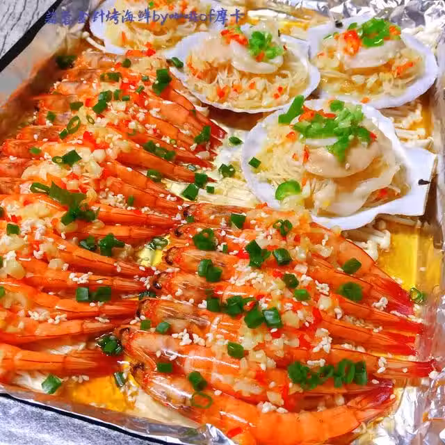 基圍蝦500克,扇貝2個,金針菇250克,粉絲1把,蒜1整頭,姜1塊,紅米辣6根,熟白芝麻1小把,糖半湯匙,小蔥2根,青線椒1根,油適量,鹽1湯匙,蒸魚豉油2湯匙,料酒1湯匙