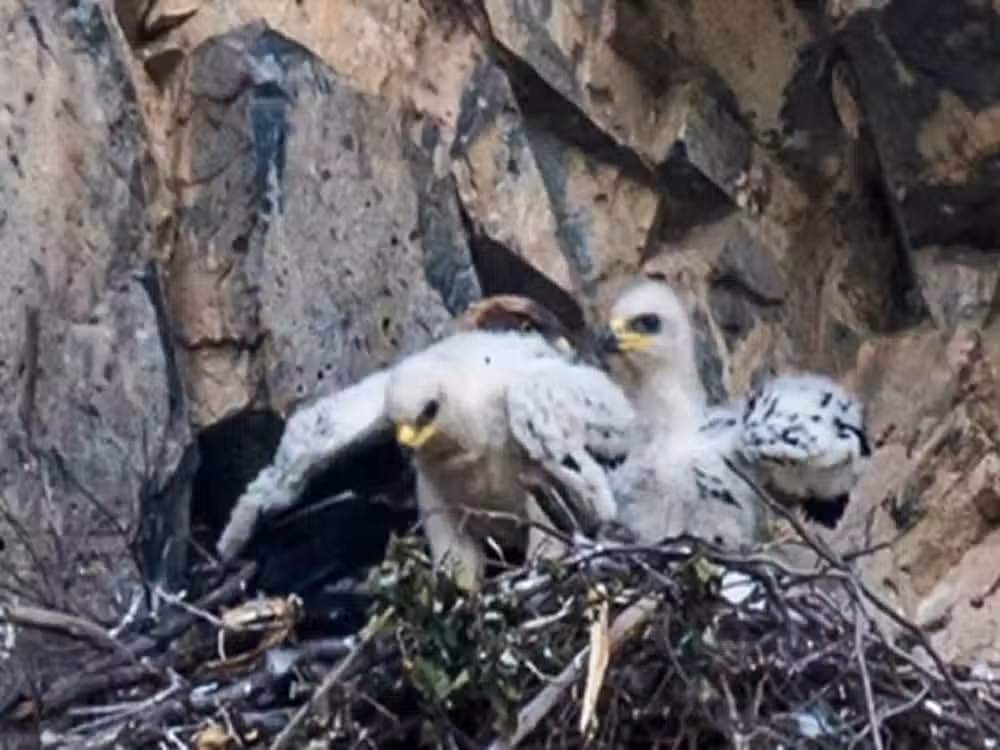 金雕幼鳥長得快,幾天時間就變了個樣,但胃口很大,特別能吃。如果金雕不能帶回足夠的食物,個頭較大的幼鳥會啄食較弱小的幼鳥。