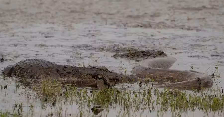 斯里蘭卡的威爾帕圖國家公園,一條澤鱷遭遇一條體型不俗的亞洲岩蟒,起初攝影師誤認為蟒蛇已經就範,鱷魚可能正打算大吃一頓,然而鱷魚那小心翼翼的態度令現場的目擊者們意識到——這條巨蟒還活著。開戰前的對峙是漫長的,在等待了整整五個小時後,攝影師們所期待的大戲終於拉開帷幕。鱷魚按捺不住首先發動了攻擊,而蟒蛇則一改之前的狀態,展現了驚人的防禦速度。據推測,這條蟒蛇應該是最近剛剛吞食了獵物,正需要時間去消化,此前一動不動的表現也就不足為奇了。鱷魚總共嘗試了三次攻擊,但是由於體型上的差距,這些進攻未能奏效,最終鱷魚意識到自己不太可能成功,離開了現場,而本就無心戀戰的蟒蛇也得以全身而退。