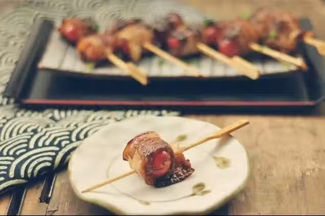 五花肉200g;聖女果數個;日式醬油少許;味啉少許;蔥花少許;竹籤一把