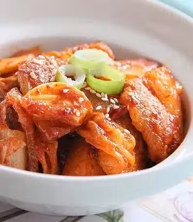 五花肉;辣白菜;蔥;蒜;韓式辣醬;黃酒;鹽;糖;芝麻