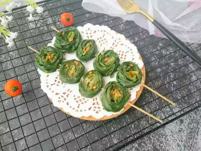 2. 韭菜2根,放一起捋直,從莖捲起來,依次做完後用竹籤串起來。