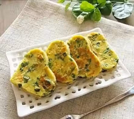3.平底鍋內放油,將一半麵糊倒入鍋中,蓋上鍋蓋,小火將其煎至定型後翻面,最後煎至兩面金黃中間熟透時出鍋切塊裝盤,剩下的一半麵糊按同樣的方法煎熟即可