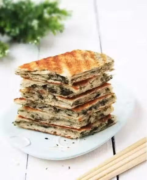 8.平底鍋內放油,下入麵餅,小火將其煎黃一面後翻面,最後煎至兩面金黃熟透後即可