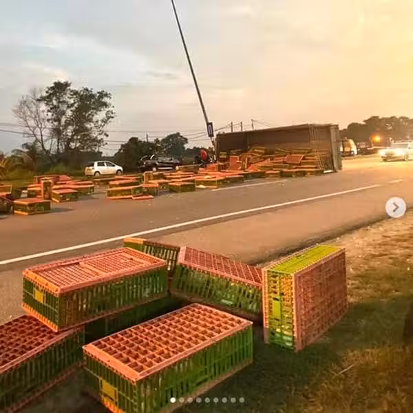 (怡保12日訊)一名拖格羅厘司機,為閃避一隻正過馬路的狗而緊急煞車,進而失控撞向左邊車道,復連撞停在路肩8輛轎車後翻覆路中央,羅厘上239個雞籠也散落馬路,所幸沒有任何傷亡事件發生!