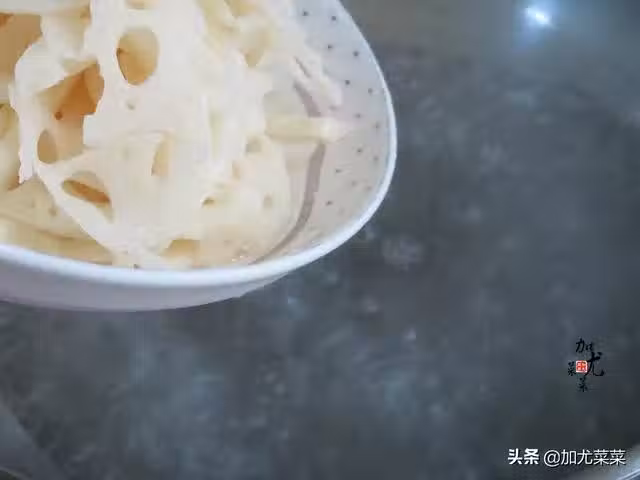 3、接著鍋里加入清水煮沸後,再倒入蓮藕片,開大火焯水30秒迅速撈起瀝干水分。水開後再倒藕片焯水,這樣可以讓蓮藕保持不變色。切忌不要用鐵鍋,否則蓮藕片會前功盡棄,出鍋還是黑的。