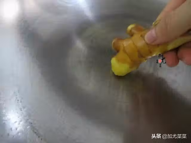 3、熱干炒鍋的水分,關火用黃姜把鍋底擦拭一遍,擦黃姜是很重要的步驟,既可以去腥,又可以形成一層保護膜以保證魚皮不破,這是煎魚訣竅之二。