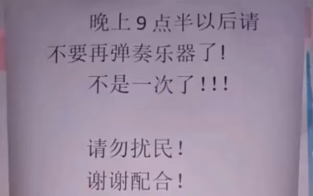 近日,有網友分享了某小區的牆壁上貼著一張紙條:「晚上9點半以後請不要再彈奏樂器了!不是一次了!!!請勿擾民!謝謝配合!」從這張紙條上不難看出,這是因為有人經常在夜間彈奏樂器影響了他人休息後,居民忍無可忍才張貼出來的。