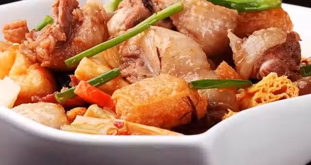 16 倒入油豆腐、冬筍片、腐竹、火腿、香菇、胡蘿蔔片翻炒2分鐘。