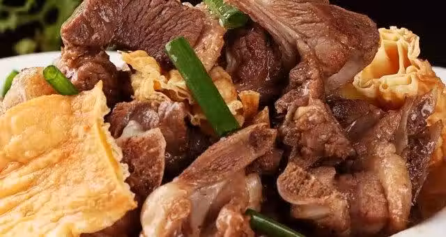 6 另起鍋,注油燒熱,倒入鵝肉,翻炒約1分鐘至斷生。
