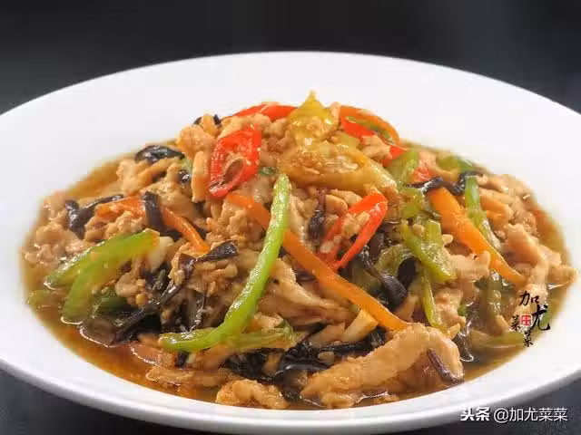 7、下一步倒入配菜黑木耳,蘿蔔絲和青椒絲翻炒至斷生。最後倒入肉絲翻炒幾下,再加入魚香汁,翻炒幾下收汁即可裝盤。
