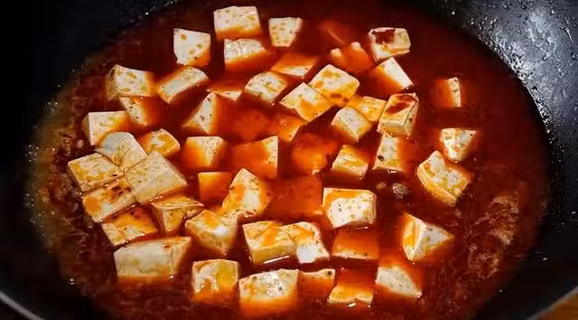 6、待豆腐入味後,出鍋前淋上水澱粉,用鏟子不斷攪拌,濃稠後即可出鍋。