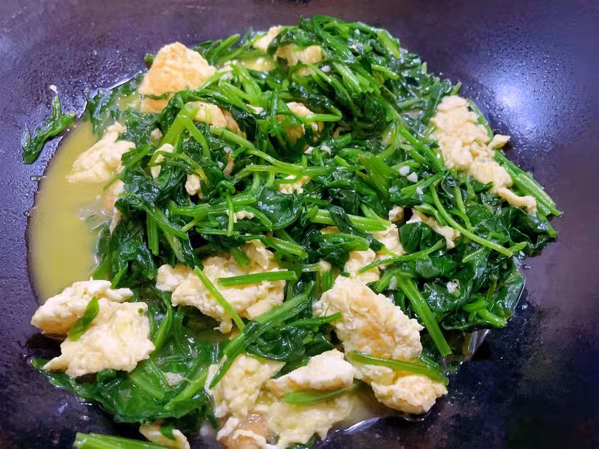 4、 鍋中繼續倒油,把菠菜倒進去快速翻炒,加一點鹽調味,再把雞蛋倒進鍋中一起翻炒,炒勻即可出鍋。