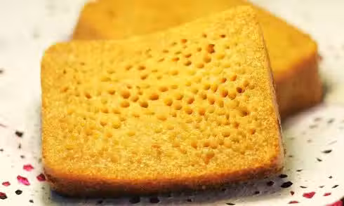 稍冷卻後將蛋糕從模具里倒出。徹底冷卻以後,將蛋糕橫切開,可以看到內部的蜂巢結構